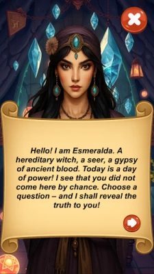 This is not just an app. This is a personal fortune telling ritual that will help you find answers to your questions about love, the future, feelings, money and the path of the soul! Ask a question, choose your path - and Esmeralda will give you one of the mystical answers inspired by ancient gypsy traditions!