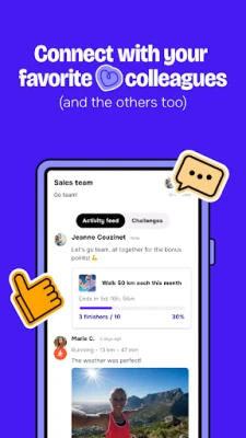 In few easy steps, connect to your company and your team using the code given to you - or ask your colleagues for it. Connect an activity tracking app to participate in the challenges.